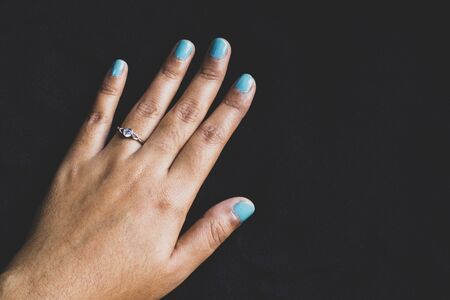 Womans hand with trendy turquoise manicure with copy space.