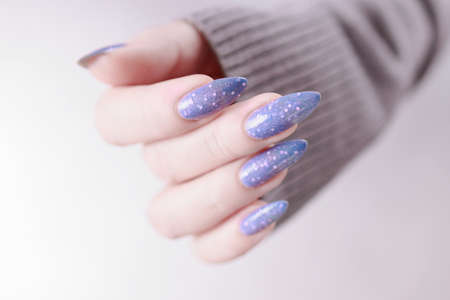 Banner female manicure purple gradient with glitter on nails. Concept cosmos, night on neutral background. copyspace.