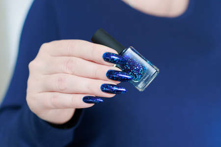 Beautiful female manicure on a blue background. Blue manicure on well-groomed hands.
