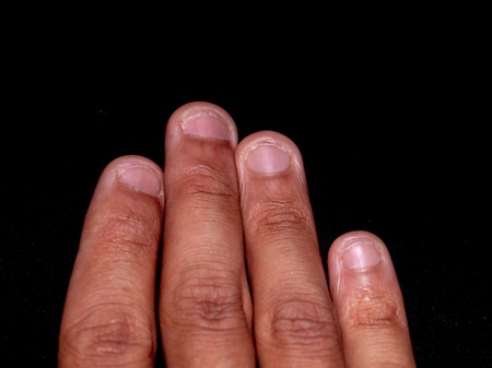 photo of reddish brown hand nails cut by teeth with black isolated background.