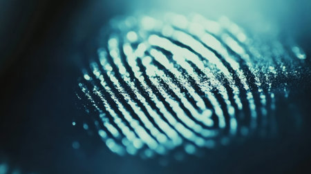 Intricate close-up of a unique fingerprint captured with soft blue lighting, highlighting texture and detail for themes of security and identity exploration.