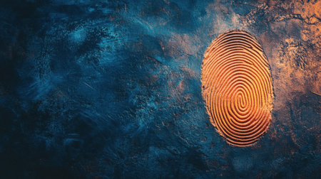This image features a vivid close-up of a fingerprint imprint set against a striking blue and orange textured background, highlighting themes of identity and uniqueness.