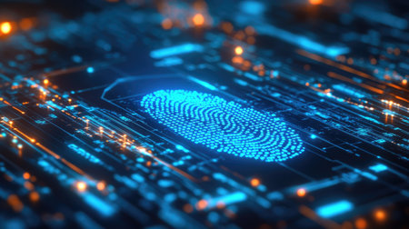 Macro view of a glowing fingerprint on a futuristic digital board. AI-generated.