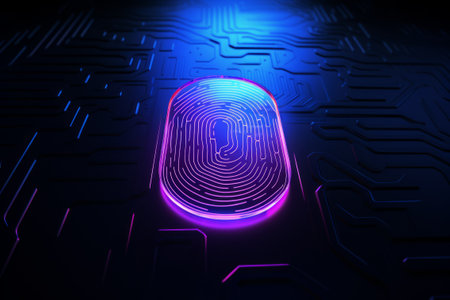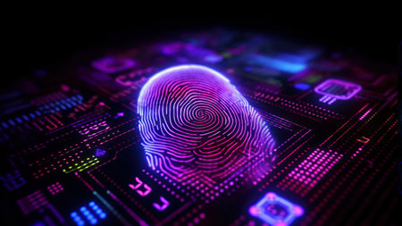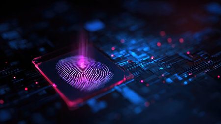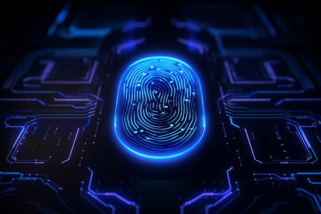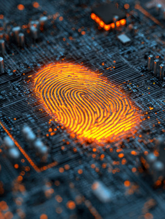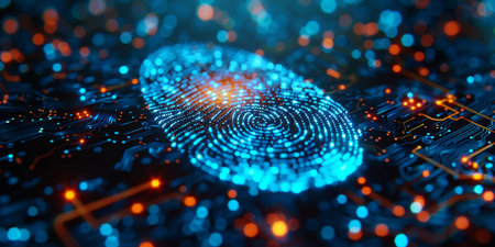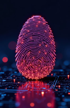 Glowing fingerprint stands out against a dark circuit board, symbolizing digital security and biometric technology. The vibrant lights emphasize the fusion of identity and innovation