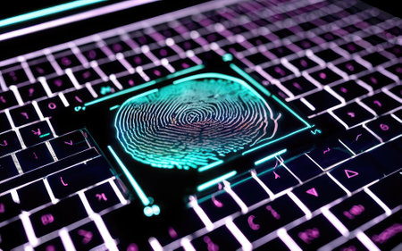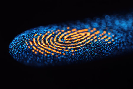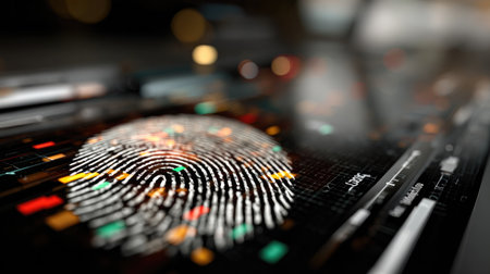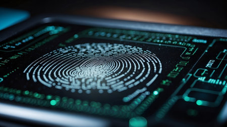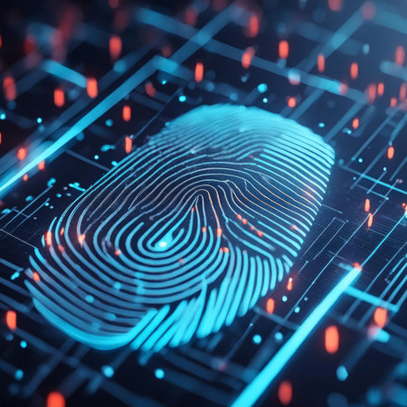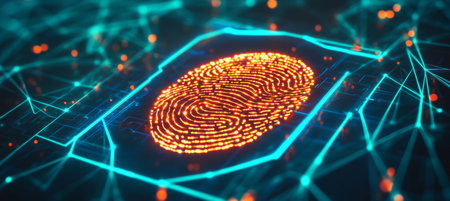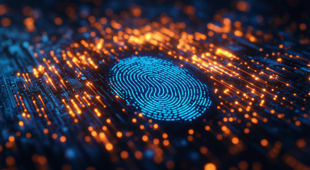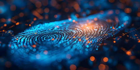 Digital fingerprint recognition with glowing data points and encryption locks symbolizing security measures