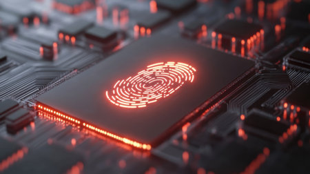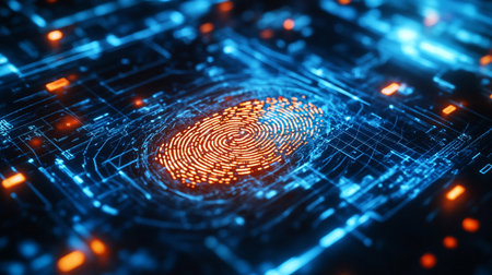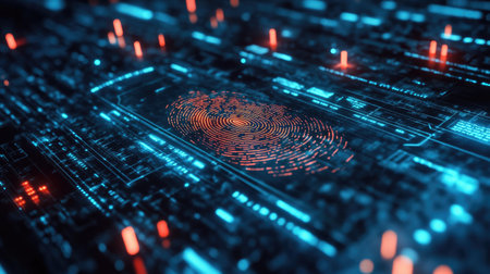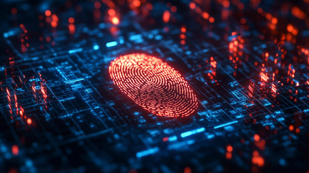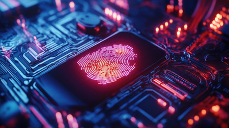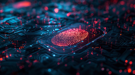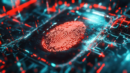 The image shows a digital fingerprint illuminated on a circuit board, with a focus on advanced technology. Blue and red light accents the futuristic design. The composition and lighting create a sense of depth. It could be useful for commercial and editorial applications illustrating cyber security.