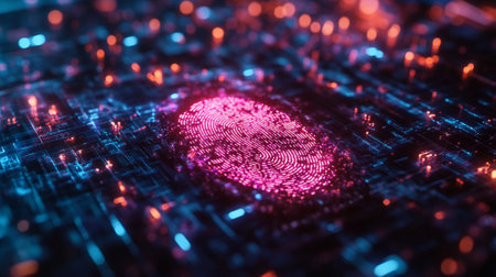 This captivating image features a digital fingerprint surrounded by a futuristic circuit board design, illuminated with vibrant neon colors and data waves.
