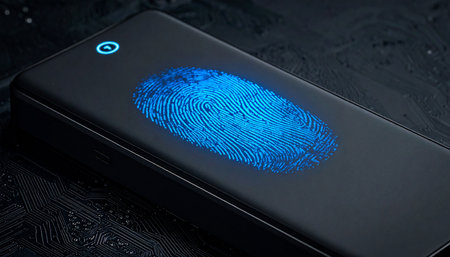 A glowing blue fingerprint illuminates the dark screen of a modern smartphone, symbolizing the seamless integration of advanced biometric security into daily life.