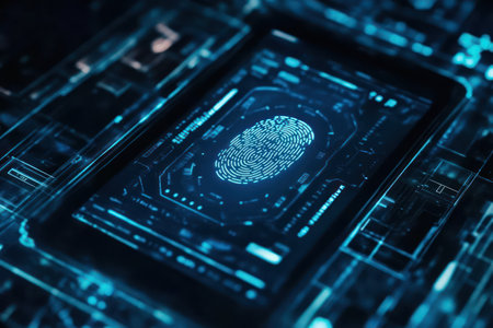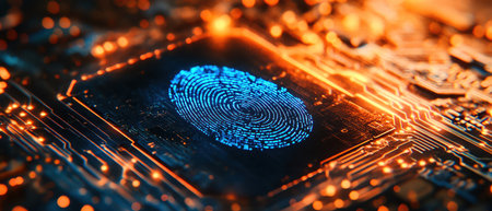 A close-up view presents a glowing fingerprint superimposed on a circuit board, suggesting digital security. The image features a blue and black color palette, with subtle bokeh lighting. The composition and style are futuristic, possibly suitable for commercial and editorial applications related to technology and cybersecurity.