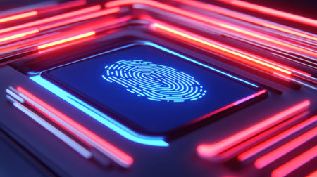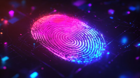 This vibrant image features a digital fingerprint on a sleek surface, enhanced by a striking display of neon lights and modern technology aesthetics.
