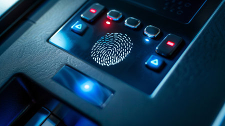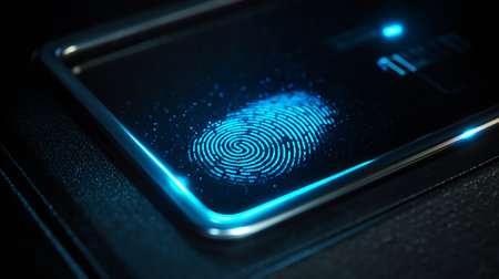 Close-up of a digital fingerprint scanner on a futuristic device, with glowing biometric data indicators