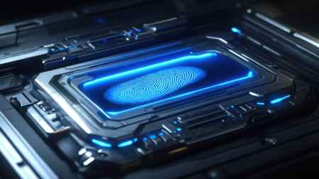 This image showcases a high-tech fingerprint scanner with glowing blue accents, emphasizing modern security technology and biometric authentication.
