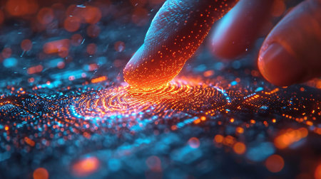 Glowing fingerprint pattern surrounded by vibrant data particles and circuits represents advancements in biometric security technology and digital identity verification in a modern context.