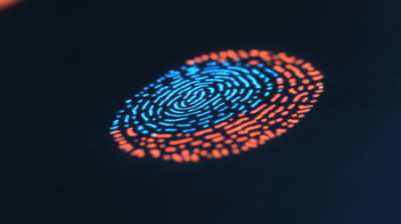 Futuristic fingerprint scan in blue and orange on dark background.