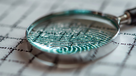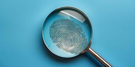 Biometric Identity Search: Closeup of a Magnifying Glass Over a Fingerprint on a Blue Background. Concept Forensic Investigation, Biometric Technology, Data Security, Crime Scene Analysis