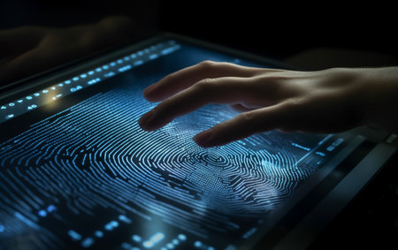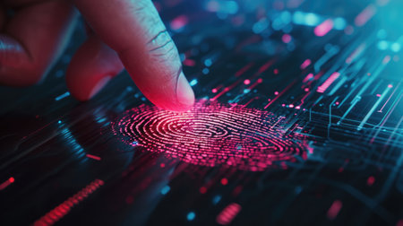 A person touches a glowing digital fingerprint sensor on a screen highlighting advanced identification technology. The scene captures the blend of human interaction and tech innovation.