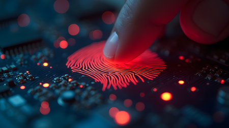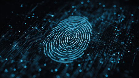 A close-up view presents a glowing fingerprint superimposed on a circuit board, suggesting digital security. The image features a blue and black color palette, with subtle bokeh lighting. The composition and style are futuristic, possibly suitable for commercial and editorial applications related to technology and cybersecurity.