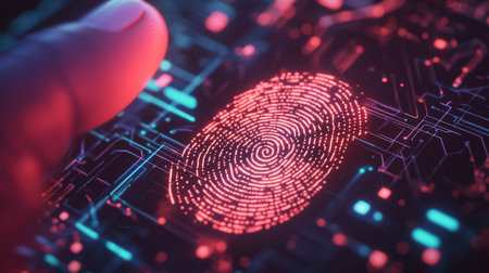 This captivating image features a futuristic fingerprint scanner interface with vibrant neon elements and intricate circuit patterns, symbolizing advanced technology and security.