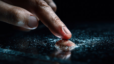 A hand is touching a fingerprint on a surface. Concept of mystery and intrigue, as the fingerprint could belong to someone unknown or have a hidden meaning