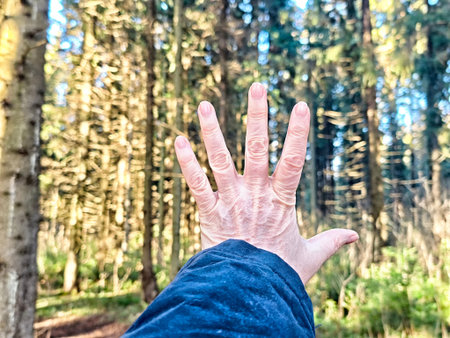 A hand is raised in a forest. Sunlight filters through the trees creating natural patterns and shadows on the ground.