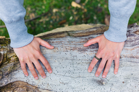 The hands of a young woman resting on a tree trunk in the park