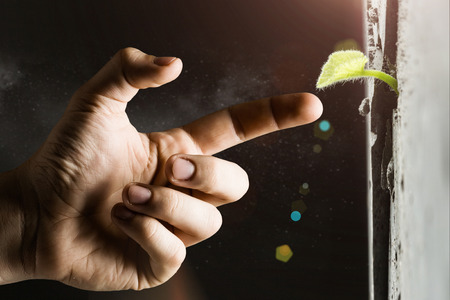 Ecology and Environment Concept, Close Up of Hand Touching Carefully Palm Tree. Taking Care of The Garden.