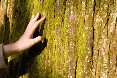Save environment,Woman hand touch the tree . Hand on tree trunk, brown tree bark, hand hold tree touch to feel texture of nature