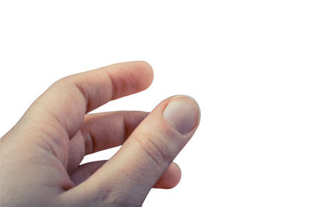 Close-up of male hand showing direction with finger on white background.