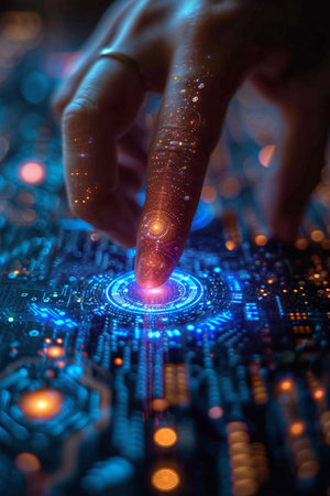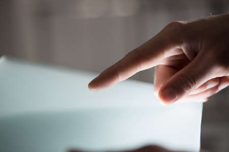 Close up of hand gently touching glowing touchscreen, showcasing interaction with technology. warm light from screen highlights details of finger, creating engaging and modern atmosphere