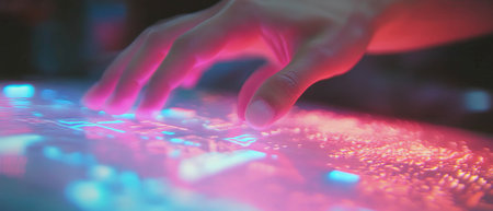 A close-up view of a hand gracefully touching a glittery surface illuminated by vibrant neon lights, creating a mesmerizing and futuristic atmosphere.