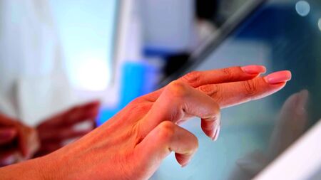 High tech medical biometrical scanner analysing health status scanning hand closeup. Digital modern device processing personal biometrics data show information. Futuristic medicine technology concept