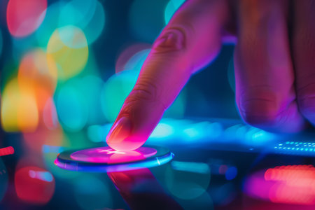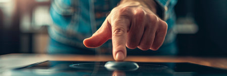 In a dimly lit setting, a human finger lightly taps a luminous interface, highlighting modern tech design and intuitive control elements.