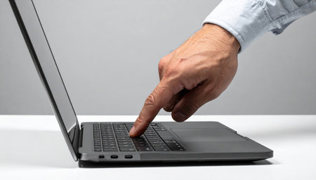 With focused precision, a professional's finger presses a key, sending a command that could launch a project, close a deal, or connect with the world.
