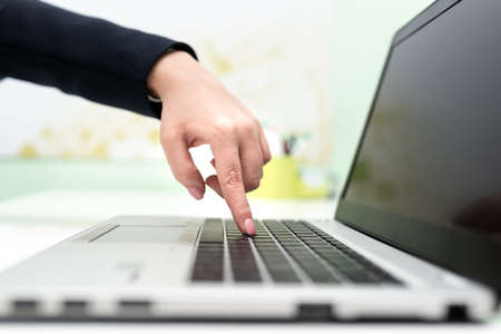 close-up female hand pressing a Backspace key for delete on a laptop keyboard