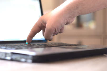 Male hands office manager pressing a touchpad on laptop, closeup of man hands with grey laptop. Man office manager working with computer, no face. Concept of work