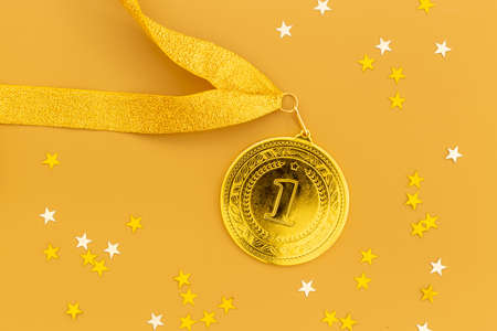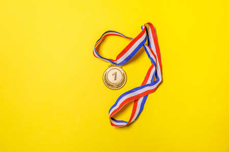 Simply flat lay design winner or champion gold trophy medal isolated on yellow colorful background. Victory first place of competition. Winning or success concept. Top view copy space