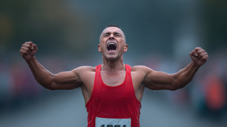A male athlete celebrates his victory with arms raised in excitement after completing a marathon in rainy weather. The powerful moment captures joy and determination.