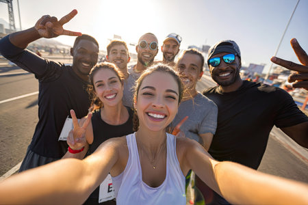 A group of diverse individuals, smiling and gesturing for a selfie, are captured in an outdoor setting. The image showcases a bright day, featuring natural light and a clear sky. Suitable for various uses, this image highlights unity and camaraderie.