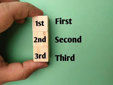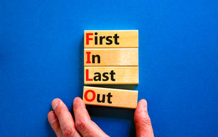 FILO first in last out symbol. Concept words FILO first in last out on wooden blocks. Beautiful blue table blue background. Businessman hand. Business FILO first in last out concept. Copy space.