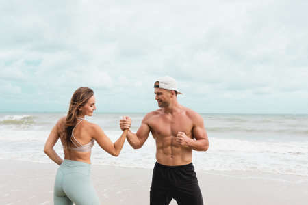 Man and woman in sportswear holding hands after the running training at the beach. Fit couple high five after outdoor exercise.