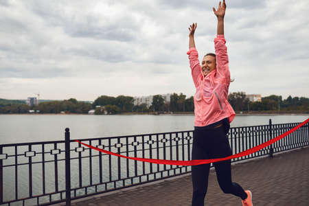 Girl runner finishes the race with a red ribbon. Winner in the sport.