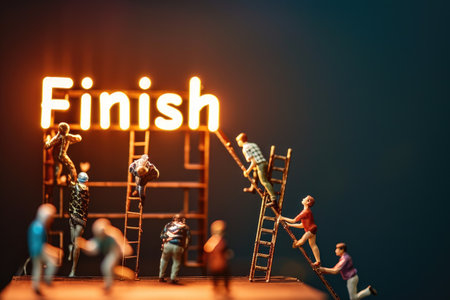 Figurine of many people action to lean on the ladder and climb up to the top a giant word Finish.