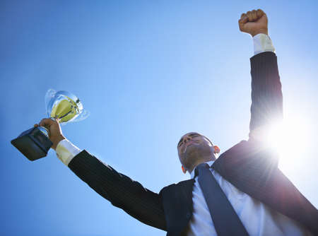 Silhouette man victory raising hands and holding gold medal with sunset sky. Motivation and success concept.
