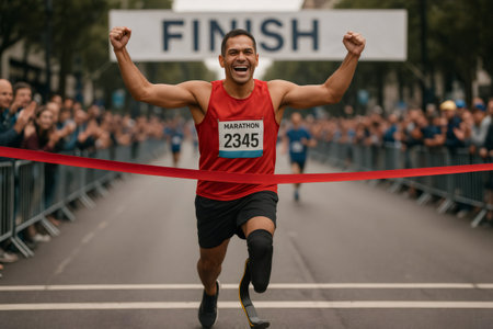 Athlete with prosthetic leg triumphantly crossing the marathon finish line, celebrating victory and inspiring determination among cheering spectators