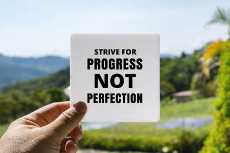 Hand Holding White Paper Card Against Fresh Nature Background. Inspirational Quote. Strive For Progress Not Perfection.