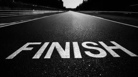 A captivating black and white photo of a finish line on a racing track, highlighting the concept of achievement, focus, and the journey toward success in sports and competition.