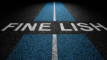This striking image captures the intricate details of an asphalt road featuring bold blue stripes and the text 'FINE LISH,' ideal for various design and artistic applications.