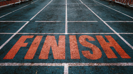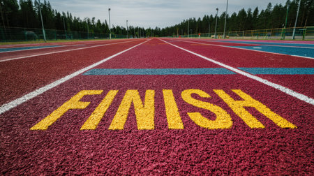 A close-up view of a vibrant finish line on an outdoor athletic track, emphasizing the motivation and excitement of sports competitions and races.