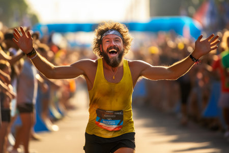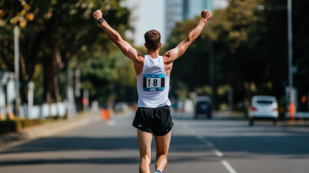 A man in a marathon victory pose, running with his arms raised high in celebration of crossing the finish line, An athlete crossing the finish line with joy, AI Generated