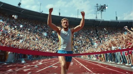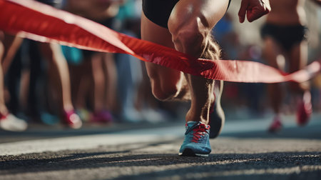 A runner's triumphant moment as they break through the finish tape, depicting victory and athletic achievement. A.I.